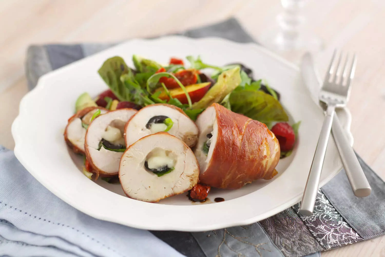 You don’t need to dine out to eat good food. Chicken breasts with fragrant basil and taleggio cheese, checkered with pitted black olives wrapped in parma ham is a true indugence. Serve up with a fresh, sweet salad; crisp lettuce and peppery rocket jewelled with nectarines, raspberries, avocados and sun-kissed tomatoes.