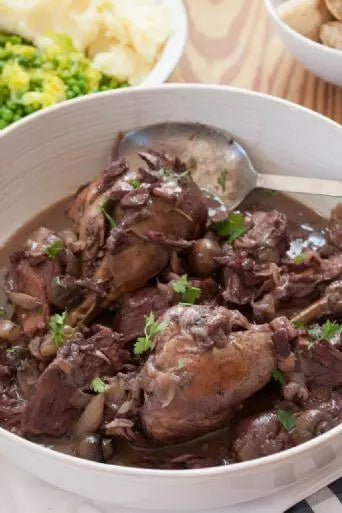 4. Pour in the wine and stock and bring to the boilAdd the bouquet garnet and season – bring to the boil then reduce to a simmer.