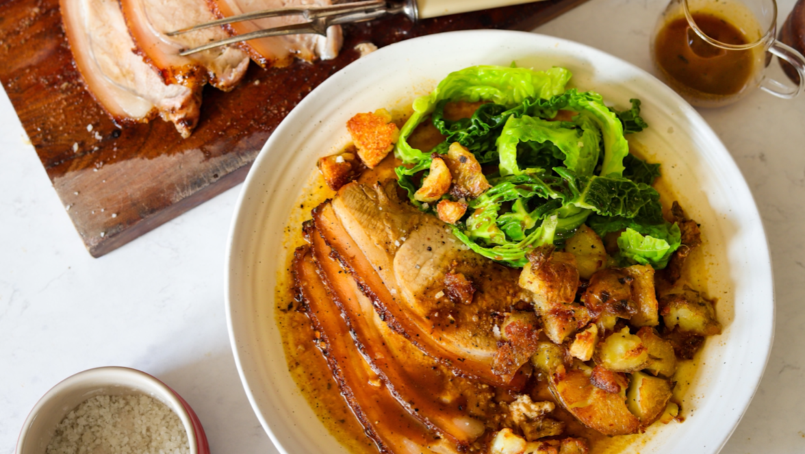 Once rested slice the pork and either lie it in its juices in the roasting tin (good to keep moist if eating later or if you’ve made this recipe to enjoy as roast pork cobs) or leave the pork on the board/platter and pour the juices from the roasting tin into