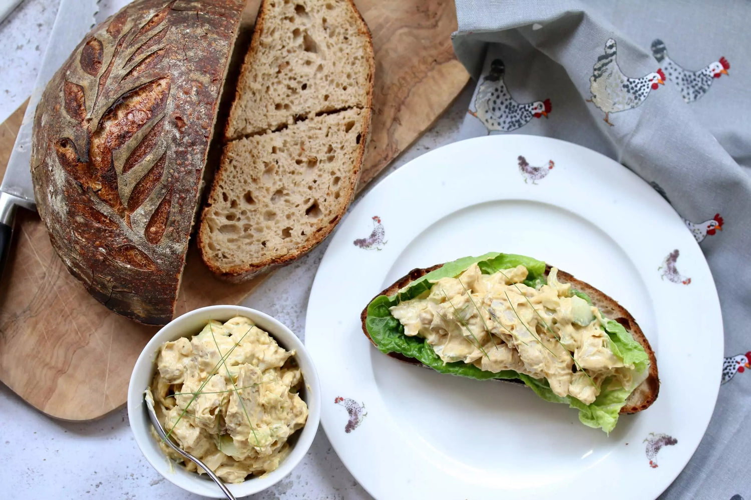Succulent Chicken picked off the bone and wrapped in a mild curry sauce. Ideal for wraps sandwiches and salads, or like here, topped onto a chunky wedge of freshly baked sourdough.