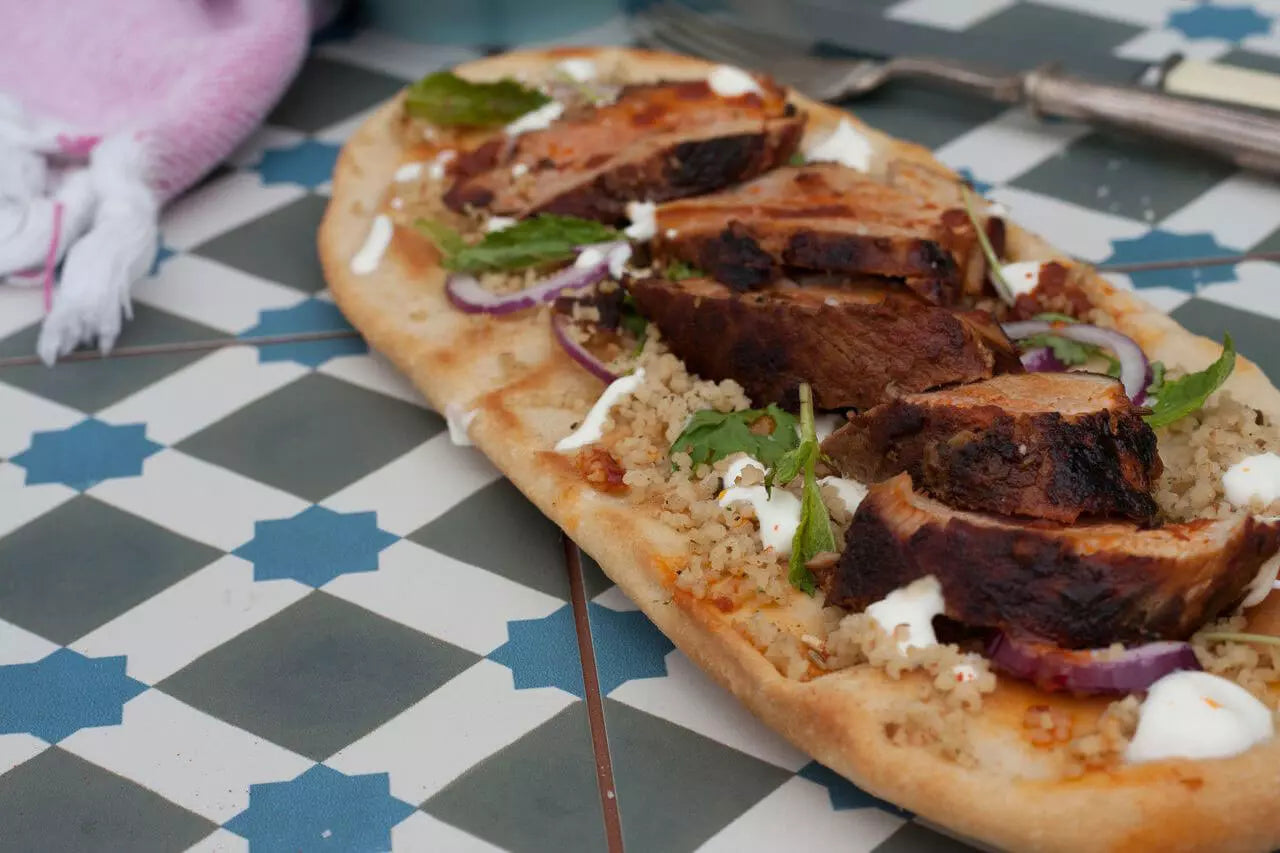4. Transfer the pork to either a very hot griddle pan or a BBQ, turning frequently until blackened and cooked through (15-20 minutes).Allow the pork to rest for 15 minutes. Griddle or oven heat the flatbreads (homemade or shop bought) – layer with slices of the pork, thinly sliced red onion, chopped mint and coriander, a sprinkle of paprika and the yoghurt. Serve with